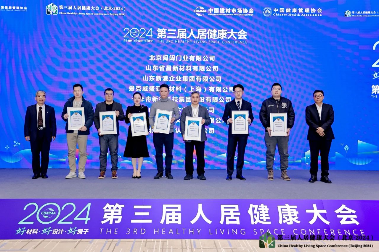 大會現場,新港集團喜訊連連,攬獲多項殊榮,獲評首批健康建材評價試點單位、健康建材標準主編單位、健康建材家居推廣大使單位稱號。