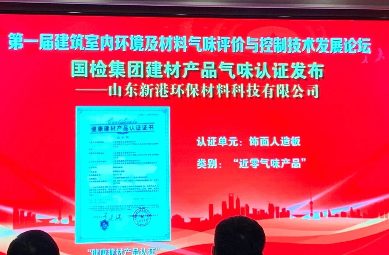 國檢集團(CTC)氣味產品認證發布會現場,山東新港企業集團有限公司正式獲頒首張近零氣味健康產品認證證書,顯示產品符合-TVa-0P40/1.0《健康產品認證實施規則 低、近零氣味產品》近零氣味產品的要求。該認證不僅填補了人造板行業空白,更是國家權威檢測機構對新港仿生精板環保性、健康性及氣味控制等方面卓越表現的肯定與認可。