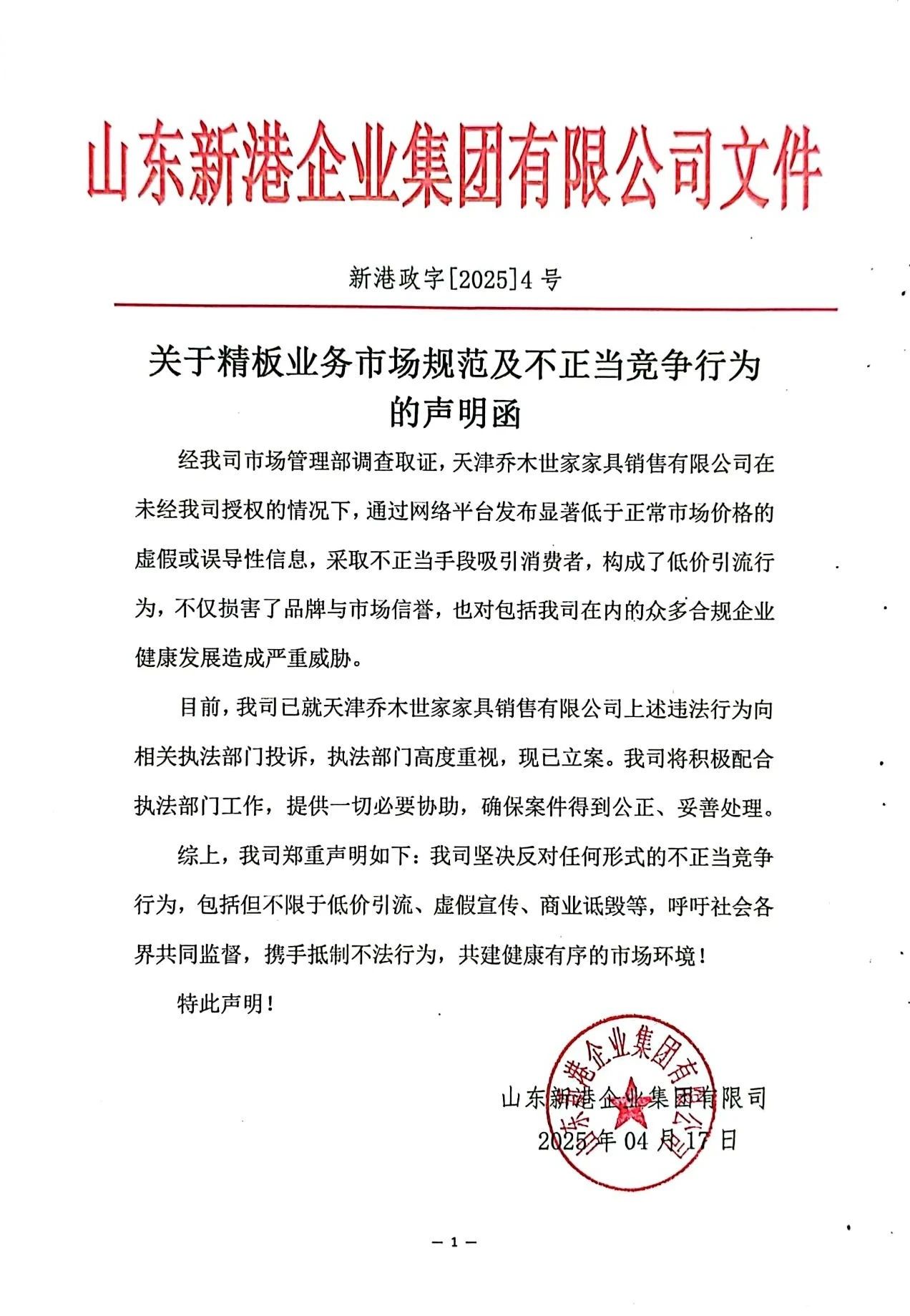 關于精板業務市場規范及不正當競爭行為的聲明函