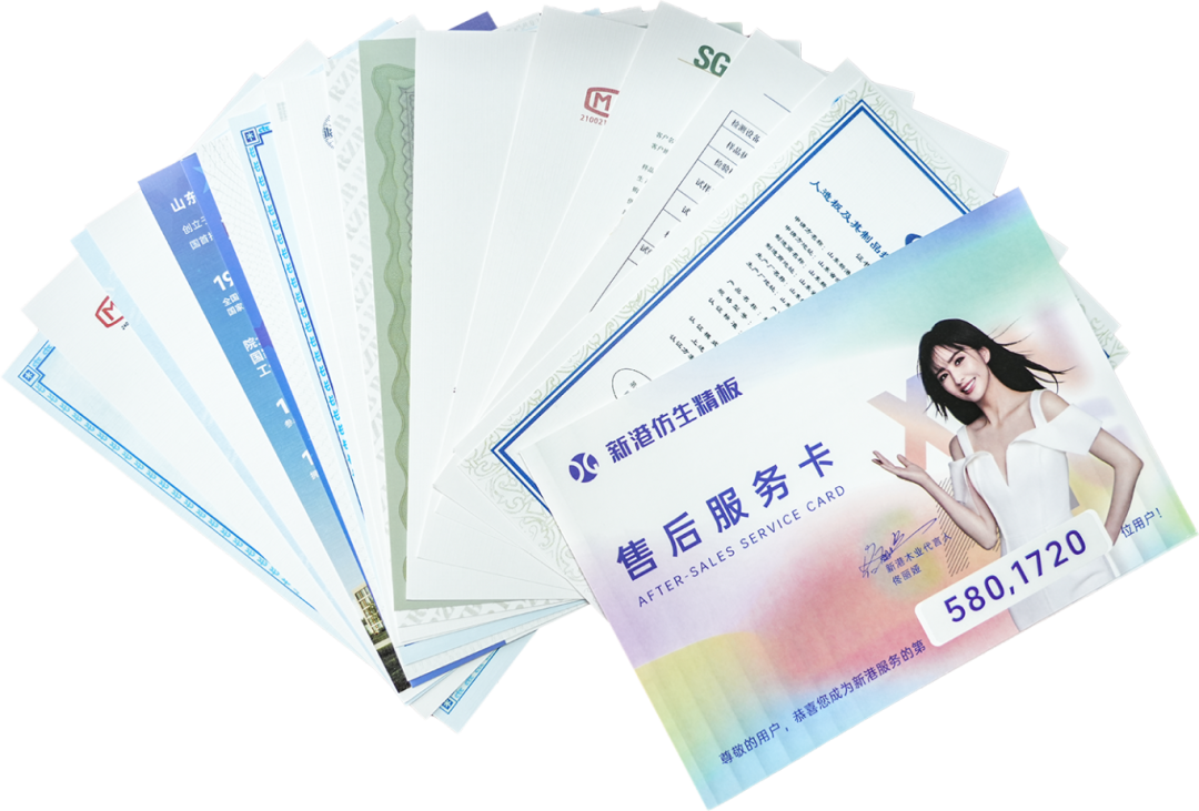 新港小紅本內含新港仿生精板全品類檢測報告及質保通行證——售后服務卡。產品如有質量問題,必須憑這張卡才能享受官方售后。卡的正面設置專屬售后服務卡編碼,您的服務商收到訂單后會把售后服務卡編碼及訂單信息上傳到「新港空間」小程序。