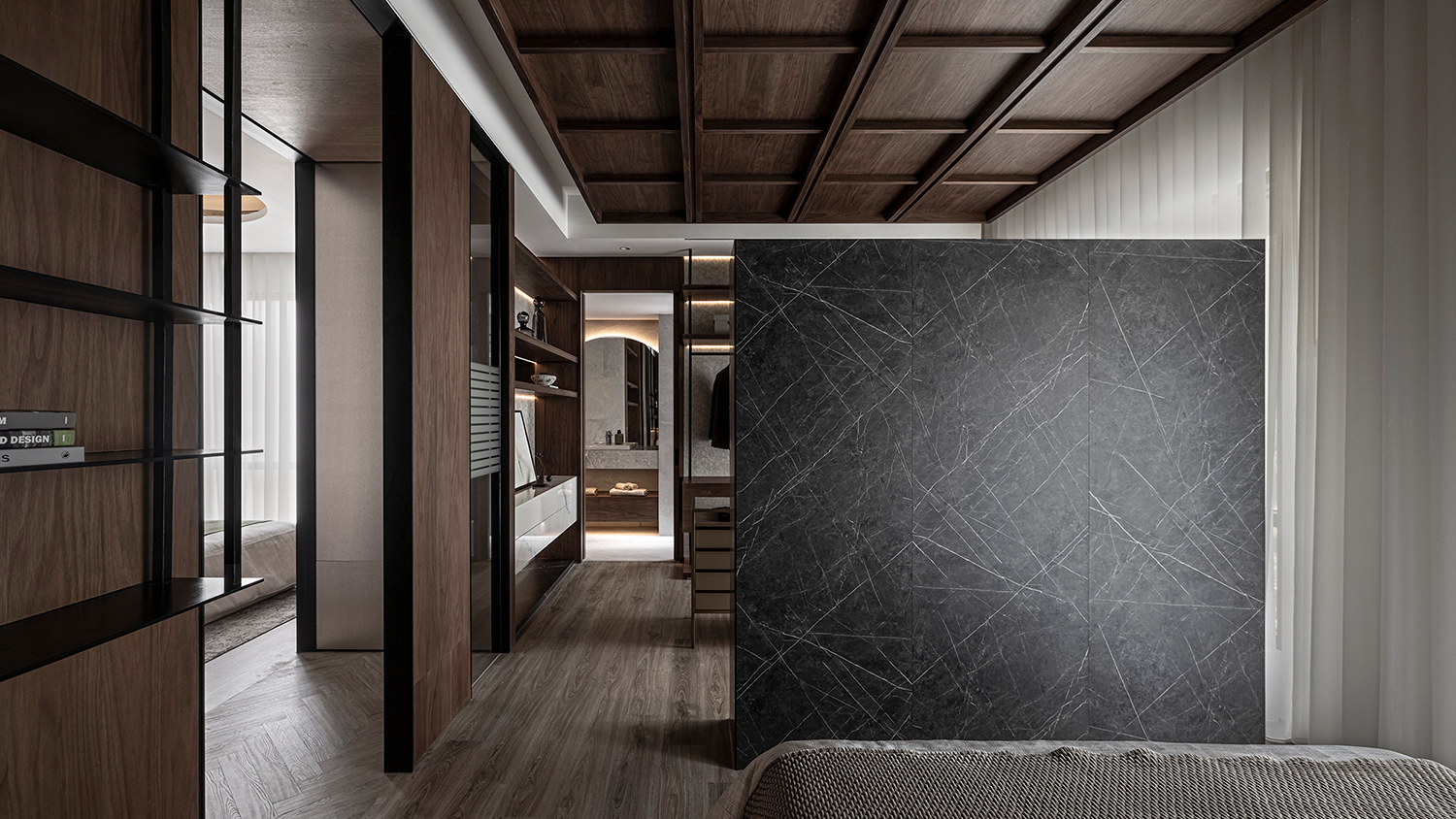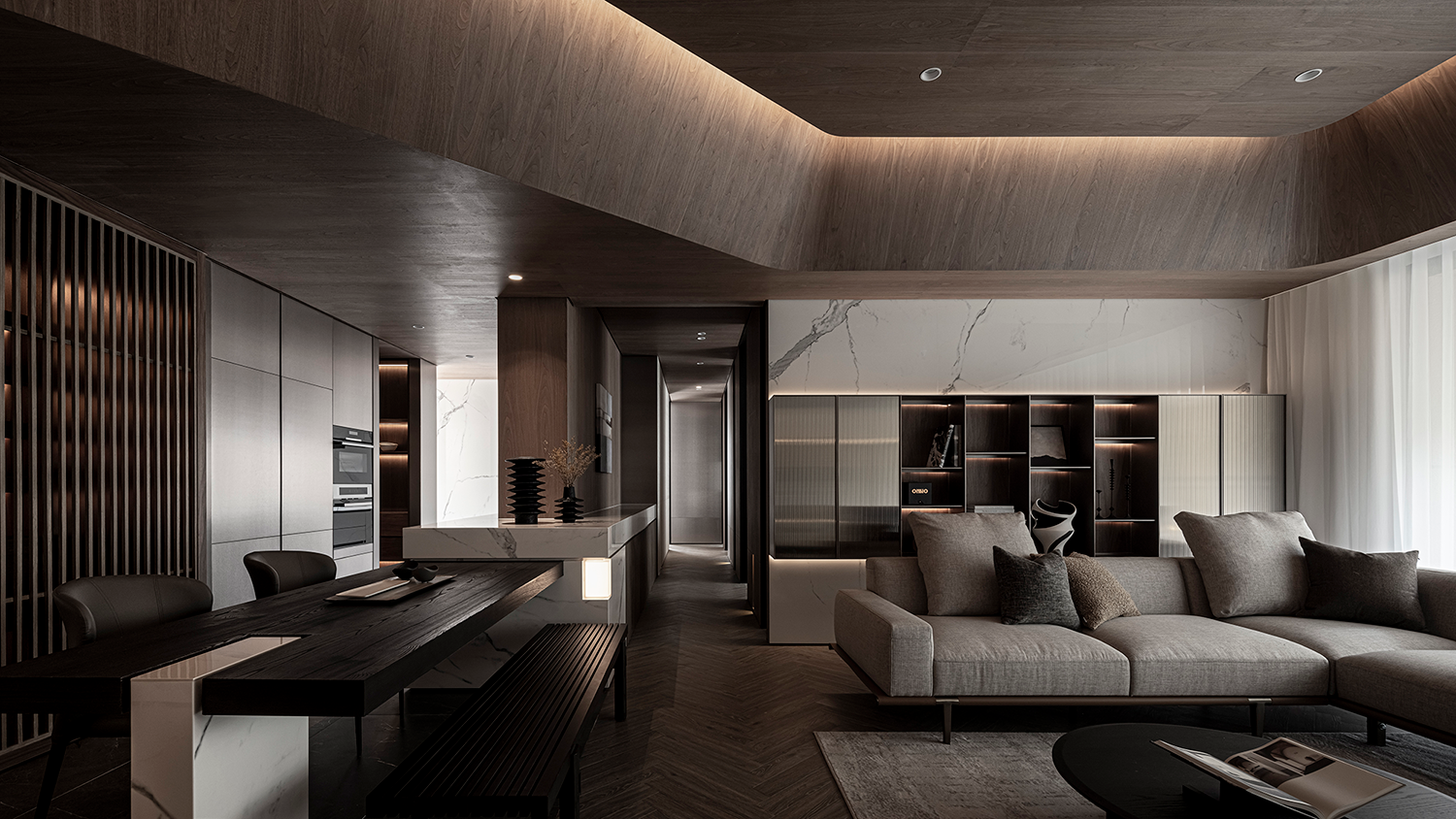以開放式格局為基底,入口經(jīng)過玄關(guān),餐廳與客廳沿生活主軸線自然串聯(lián)。透過地坪材質(zhì)的分割,進(jìn)行場域的劃分與引導(dǎo),其中客廳鋪設(shè)木地板,搭配胡桃木色天花,強(qiáng)化空間的包覆感與深邃氣息。