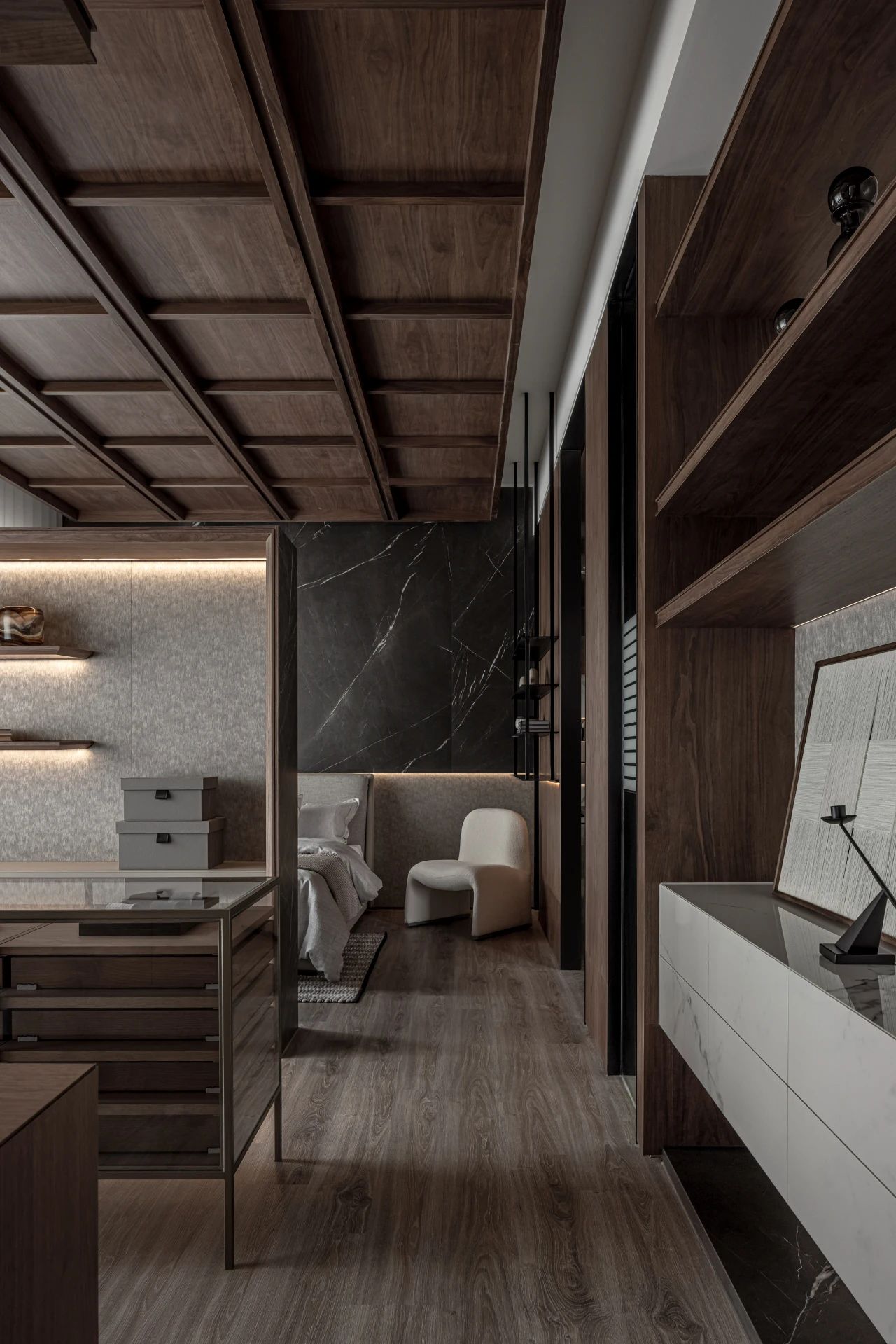 更衣室靈感汲取自精品酒店配置邏輯:獨(dú)立飾品陳列區(qū)、精心規(guī)劃的長衣懸掛區(qū)與疊衣展示區(qū),搭配兼具梳妝與書寫功能的工作臺(tái),共同構(gòu)筑了一個(gè)集高效收納與美學(xué)展示于一體的優(yōu)雅場域。