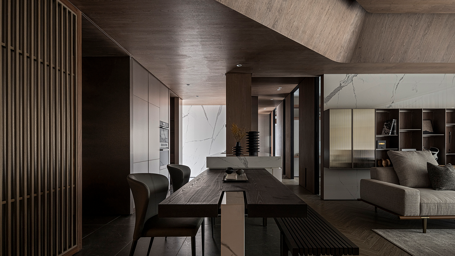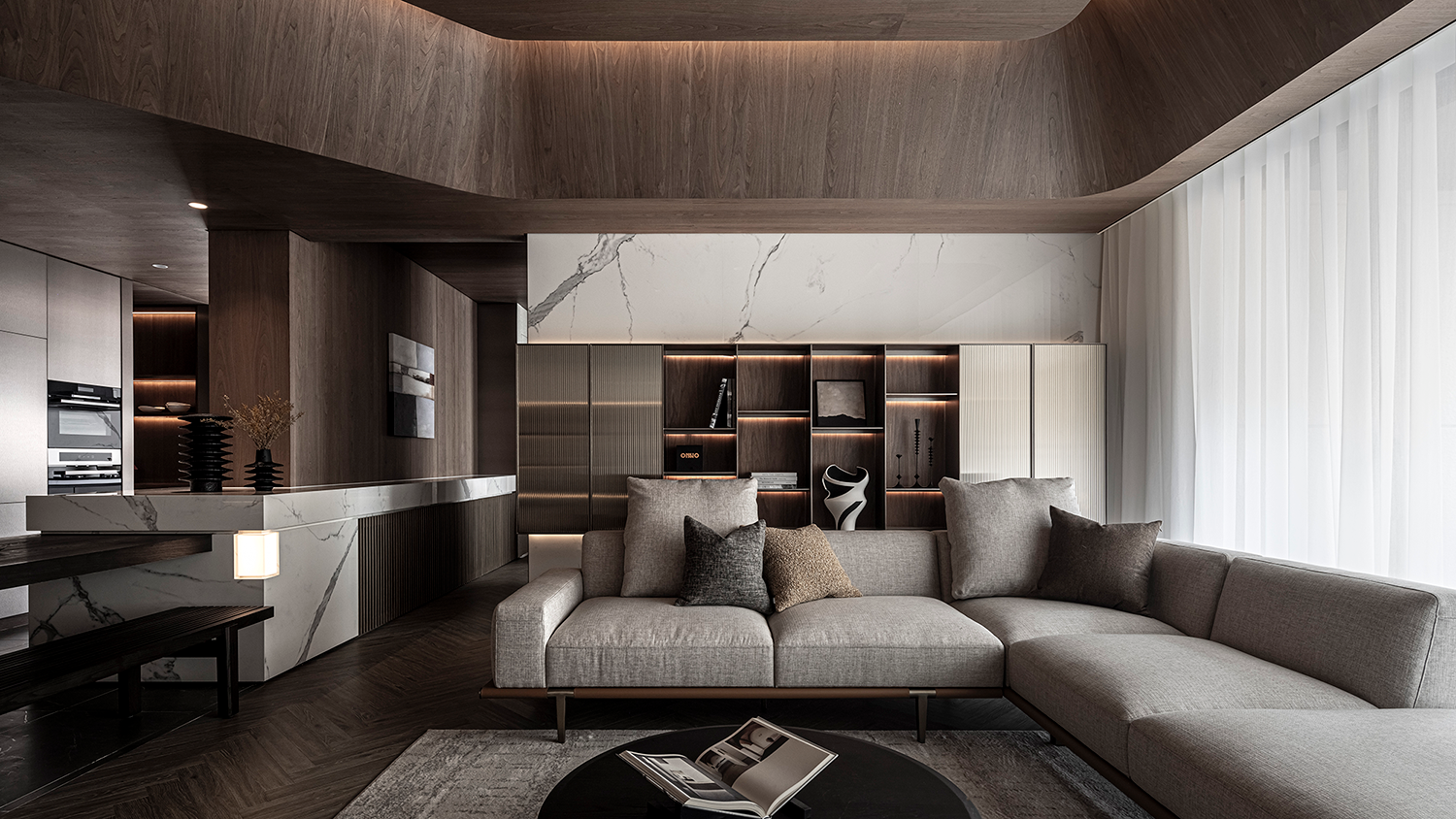 客廳底墻則運(yùn)用大理石結(jié)合開放展示柜,柜門嵌入茶色長虹玻璃,獨(dú)特的紋理和半透光特性,呈現(xiàn)更為輕盈的感受。中廚結(jié)合中島與酒窖,整合生活機(jī)能的同時(shí),延續(xù)金屬板的材質(zhì)語匯,提升整體的統(tǒng)一性與設(shè)計(jì)連貫性,以真實(shí)的材料打造視覺與觸感的雙重體驗(yàn)。