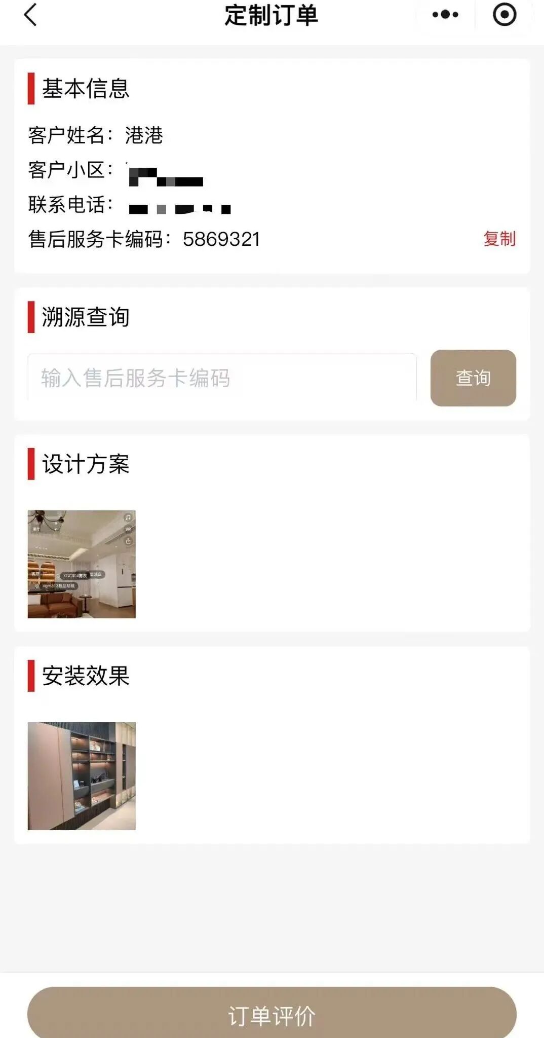 操作步驟:微信搜索「新港空間」→「我的」→「定制訂單」→ 輸入售后服務卡正面的數字編碼,即刻顯示產品溯源結果。