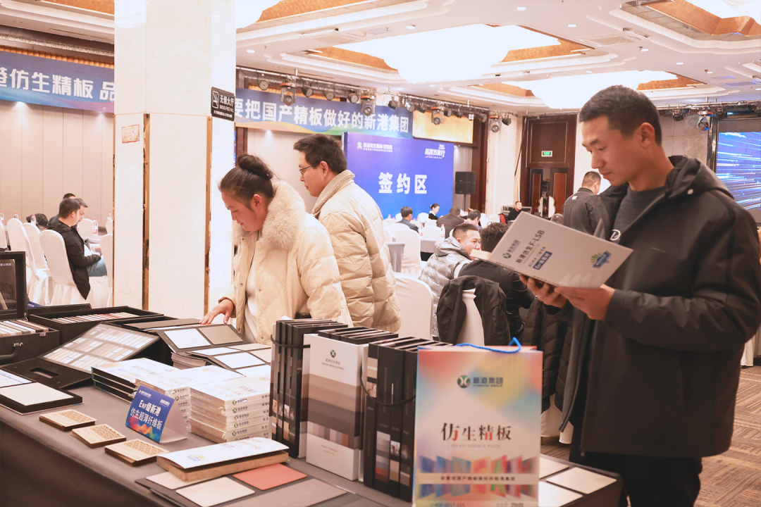 在品牌萬里行活動現場,新港仿生精板45款花色集中亮相,30款通配花色,15款飾面大師版,解鎖全新花色紋理,感受新港仿生精板的出色品質。