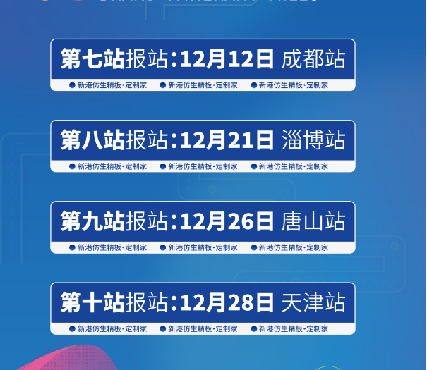 聚勢前行,征程繼續,12月,新港仿生精板品牌萬里行將前往成都、淄博、唐山、天津四個城市站超燃接力,聚焦行業痛點,共謀未來新篇,更有神秘大咖空降現場,精彩不容錯過!