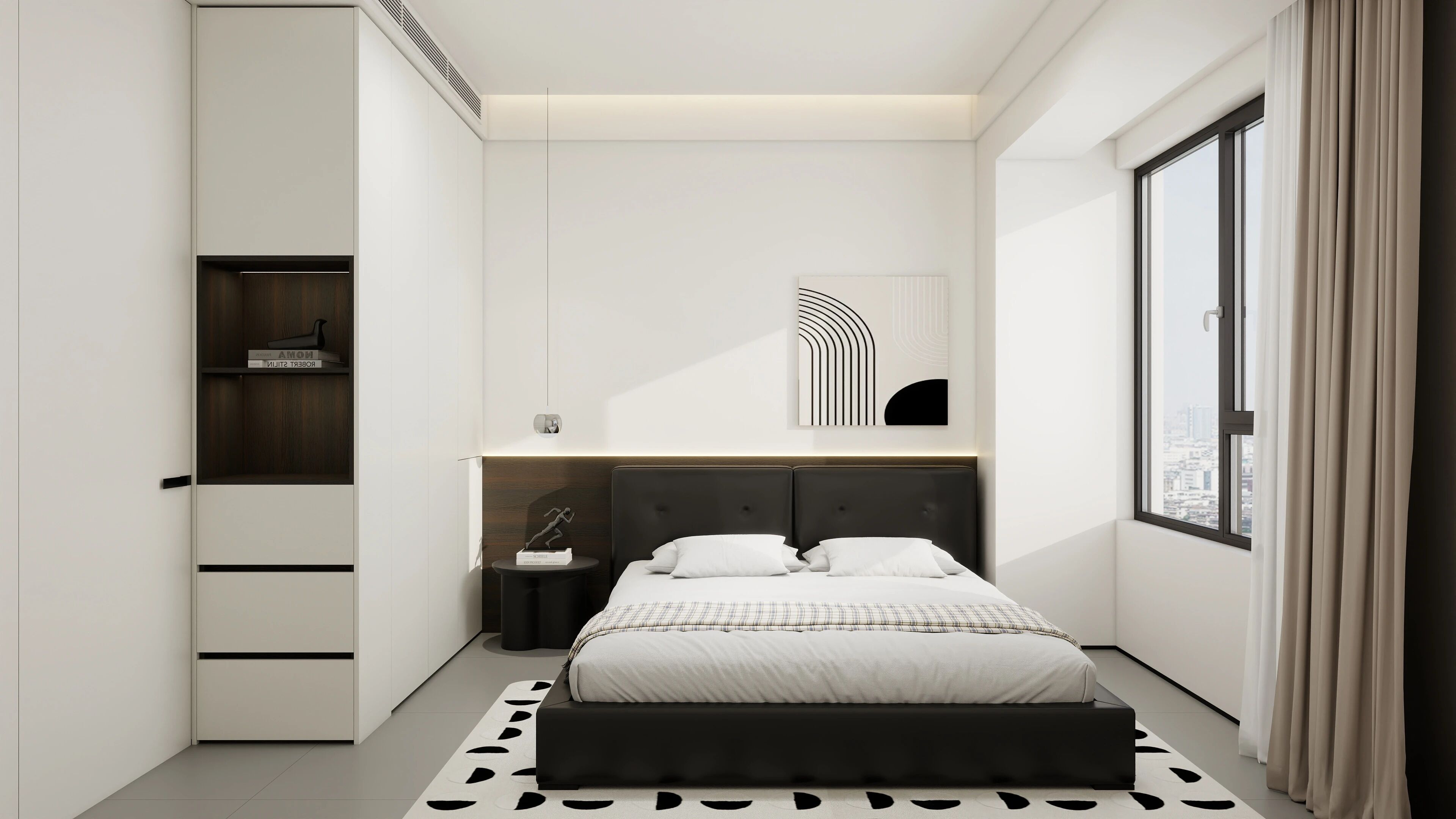 當(dāng)空間歸于極簡時,更能展現(xiàn)出雅白的魅力。這間臥室,只采用黑、白、卡其三種常見卻自帶高級感的色彩。雅白衣柜正面窗戶,隨著一天中陽光照射的強度與角度的變化,柜體自然呈現(xiàn)出漸變的色彩。晨曦的溫潤、日光的溫暖、夕陽的燦爛,都在這小小的衣柜里收納。