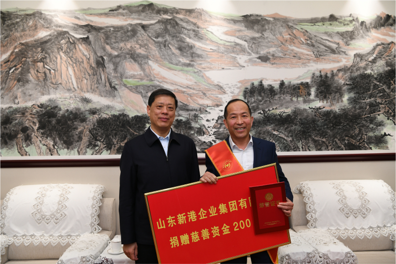 2021年1月,新港集團向市慈善總會捐贈200萬元,時任市委書記王安德向新港集團頒發證書。